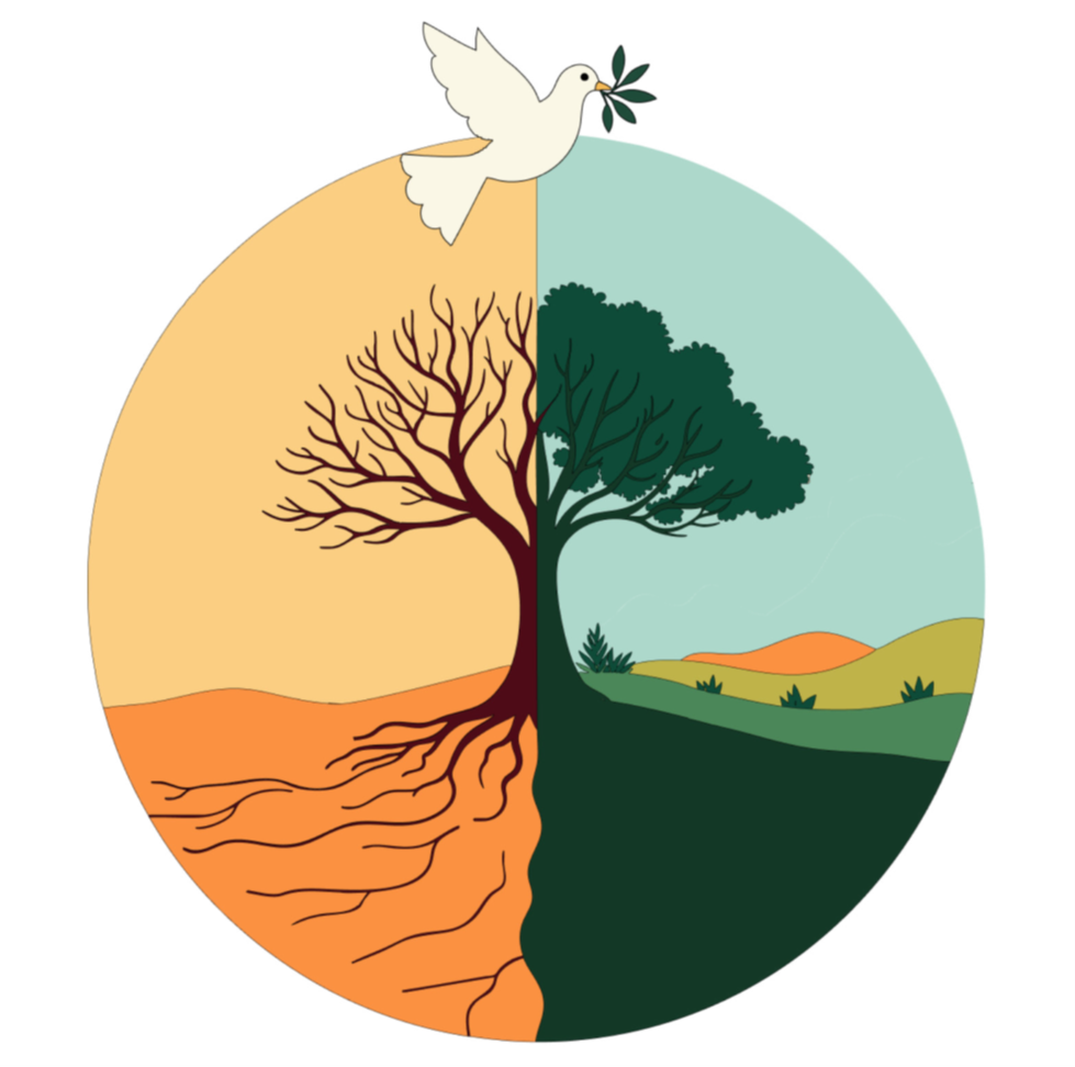 The 2025 Symbol inspired by Isaiah 32:14-18 and titled “Garden of Peace,” depicts a white dove flying over a tree. The left side of the tree is barren, with roots digging into dry soil, surrounded by an arid, desolate landscape. In contrast, the right side of the tree is lush and green, standing amidst a flourishing landscape. The dove, carrying an olive branch in its beak, flies toward the right—symbolizing peace as a transition from a war-torn, overexploited land to one that is fertile, thriving, and hospitable.